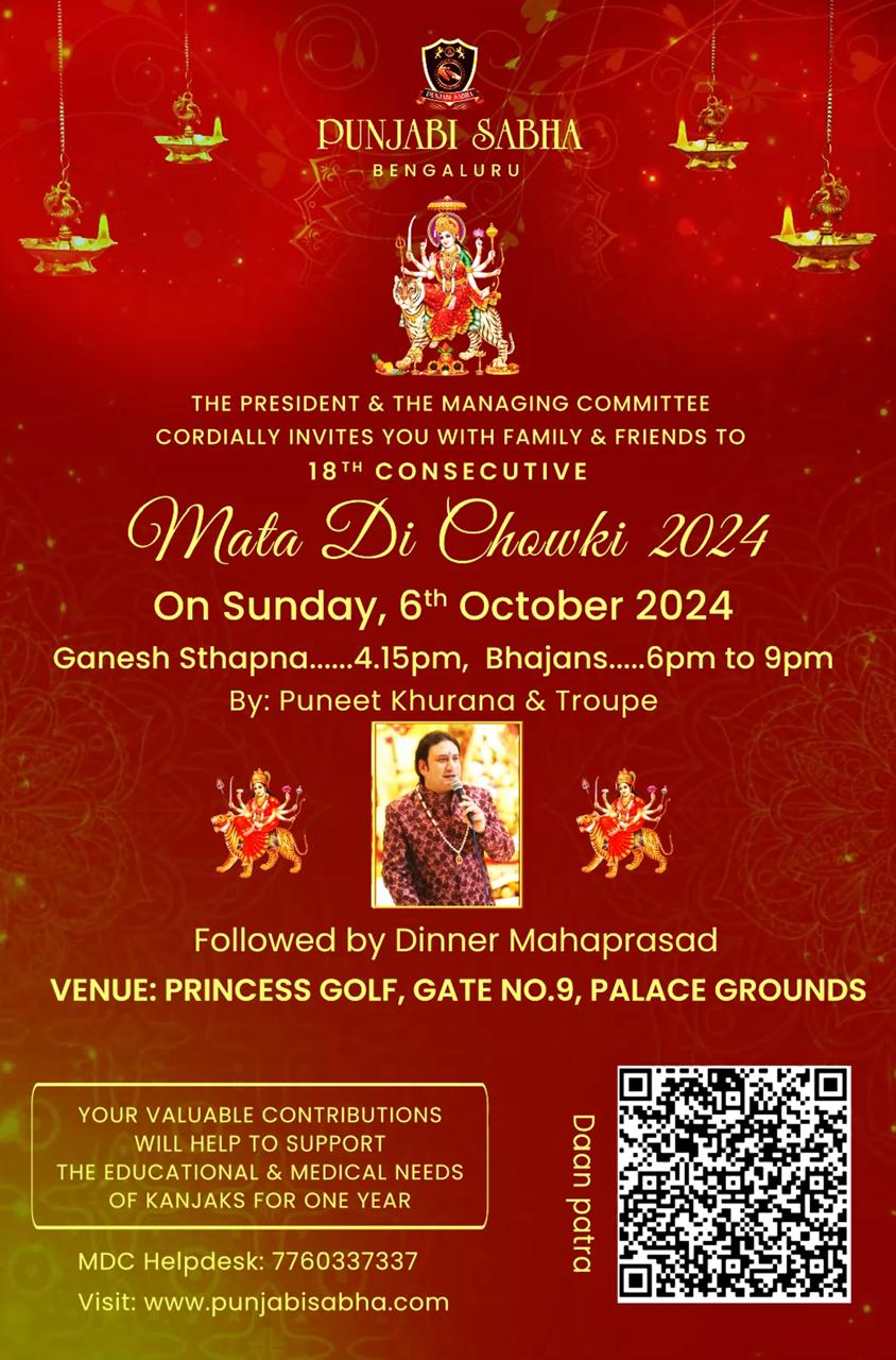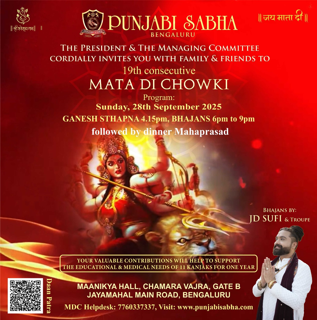 View MorePunjabi Sabha, Bengaluru warmly invites you to its 19th Consecutive Mata Di Chowki—an evening of divine devotion and community bonding. Immerse yourself in soulful bhajans by JD Sufi & troupe, experience the spiritual energy of Maa Durga, and join fellow devotees in prayer and celebration. The event will conclude with a heartfelt serving of Mahaprasad (dinner). Your participation also supports a noble cause, helping fund the education and medical care of 11 Kanjaks for an entire year. Come, be a part of this sacred celebration and receive Maa’s blessings.